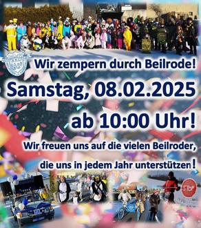 Das närrische Treiben beginnt mit dem traditionellen Zempern durch Beilrode. Ab 10:00 Uhr ziehen wir mit Musik, guter Laune und fantasievollen Kostümen durch die Straßen. Freuen Sie sich auf eine lebendige Tradition, die Jung und Alt begeistert!