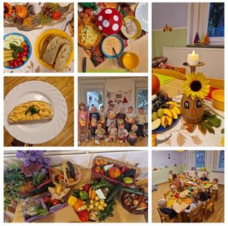 In der letzten Septemberwoche feierten wir gemeinsam mit den Kindern das Erntedankfest. Dafür haben wir im Vorfeld leckere Speisen und Getränke für das gesunde Frühstück zubereitet. Dabei schmückten Dinkelbrot, Eiersalat, Feta-Paprikacreme, Heidelbeeraufstrich und frisch gepresster Orangensaft unseren Tisch. Jedes Kind hatte ein Körbchen, gefüllt mit saisonalem Obst und Gemüse, mitgebracht. Aus diesen zauberten die Erzieherinnen leckere Speisen der Herbstzeit. So durften die Kinder sich über eine selbstgekochte Gemüse- und Kürbissuppe freuen sowie über Obstsalat, Birnenkompott und Pflaumenkuchen. Abschließend begrüßten wir die neue Jahreszeit mit einem Herbstlied. Wir bedanken uns bei allen Eltern, die das Frühstück sowie die tollen Erntekörbchen ermöglicht haben.