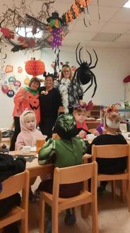 Die Eltern bereiteten gruslige Köstlichkeiten für die Party zu und die Erzieherinnen schmückten die Kita mit Spinnennetzen, Kürbissen und Hexen. Schaurig verkleidet feierten die Kinder und die Erzieherinnen mit Musik und Spielen.