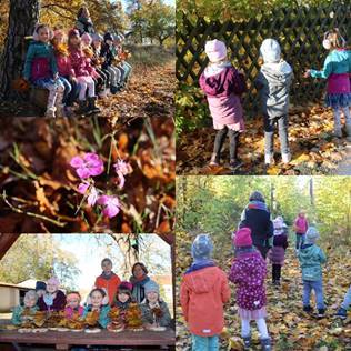 Bei unserem Kita O-M-A Projekt am 5. November konnten wir den Herbst einfangen. Jeder hatte einen vorgefertigten kleinen Ast mit einem Kastanienkopf in der Hand, durfte nach Belieben bunte Blätter aufspießen und so das Kleid wachsen lassen. Dabei hatten wir aufmerksam große Augen und begegneten dem sonnigen Tag voller Freude. Mit Wackelaugen hauchten wir unseren „Waldgeistern“ Leben ein.