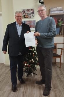 Bürgermeister Holger Reinboth ehrte seinen Stellvertreter Eugen Pätzsch für sein umfangreiches ehrenamtliches Engagement mit einer Zuwendung aus dem Ehrenamtsbudget unseres Landkreises. Das von Landrat Kai Emanuel signierte Schreiben würdigt den Geehrten für seinen langjährigen, engagierten Einsatz im kommunalen und vereinlichen Leben der Gemeinde. Eugen Pätzsch ist Vorstandsmitglied im Ostelbien-Verein und engagiert sich im Arzberger Heimatverein. In diesen Funktionen kümmerte er sich um die Gestaltung des Kinderfestberges und andere Projekte in der Gemeinde. Die Ehrung wurde ihm zur Jahresendveranstaltung des Ostelbien-Vereins am 27. November im Arzberger O-M-A-Haus zuteil. Danke, Eugen!