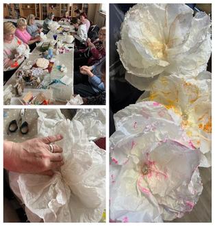 Wunderschöne Blüten aus Butterbrotpapier entstanden beim modernen Basteln mit Pfiff im Februar.