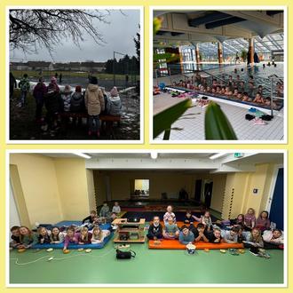 Mit guter Laune und viel Vorfreude sind wir in die Ferien gestartet – und das ganz entspannt mit einem abwechslungsreichen Programm. Am Mittwoch stand ein Besuch in das Aquavita in Torgau auf dem Plan. Ob beim Rutschen, Tauchen oder einfach beim gemütlichen Planschen im warmen Wasser – alle kamen auf ihre Kosten. Für viele war das freie Spielen im Wasser das absolute Highlight und sorgte für strahlende Gesichter. Am nächsten Tag verwandelte sich unser Turnraum in ein gemütliches Kino. Mit Matten, Decken und mitgebrachten Snacks entstand eine tolle Kinoatmosphäre. Gemeinsam einen Film zu schauen, zusammen zu lachen und mitzufiebern, machte den Vormittag zu einem besonderen Erlebnis. Das „Kino im Turnraum“ war eine schöne Gelegenheit, zur Ruhe zu kommen und die Gemeinschaft zu genießen. Sportlich ging es schließlich beim Kegeln weiter. Mit viel Ehrgeiz, aber vor allem mit Spaß, wurden die Kugeln über die Bahn gerollt. Jeder Wurf wurde bejubelt – ganz egal, ob alle Neune fielen oder nicht. Der freundschaftliche Wettbewerb sorgte für gute Stimmung und rundete unseren Ferienstart perfekt ab. So begann die Ferienzeit mit einer gelungenen Mischung aus Bewegung, Entspannung und gemeinsamen Erlebnissen – besser hätte der Start kaum sein können.