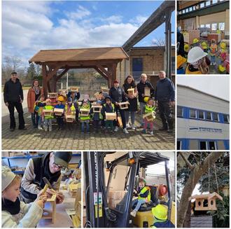 Im Rahmen des bundesweiten Kita-Wettbewerbes unter dem Motto „Kleine Hände, große Zukunft“ von der Handwerkskammer zu Leipzig besuchten wir die Tischlerei der Elbaue-Werkstätten in Torgau, um den Beruf des Tischlers aus nächster Nähe kennenzulernen. Einführend wurde uns durch Herrn Hirsch die gesamte Werkstatt gezeigt. Dabei entdeckten die Kinder einen Gabelstapler und durften einmal auf diesem sitzen. Aber auch die vielen Holzarbeiten und Maschinen sorgten für Begeisterung. Nach der Führung konnten die Kinder selber aktiv werden. In der Holzwerkstatt hatten die Mitarbeiter bereits etwas vorbereitet: Jedes Kind durfte sein eigenes Vogelhäuschen bauen! Dabei erhielten sie tolle Unterstützung von den Betreuern sowie Mitarbeitern der Elbaue-Werkstätten. Mit ganz viel Liebe und Geduld haben diese den Kindern beim Bau geholfen. So entstanden 15 Vogelhäuschen, welche mit nach Hause genommen werden durften. Es war für alle eine tolle Erfahrung und ein sehr interessanter Vormittag. In diesem Sinne bedanken wir uns bei den Mitarbeitern der Elbaue-Werkstätten Torgau.