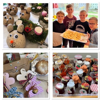 Am 29.03.2023 fand der 1. Ostermarkt in unserem Hort statt. Die Kinder, Erzieher und Eltern der Klassen 1 - 4 beteiligten sich daran, kreative Dinge für das Osterfest herzustellen. So entstanden wunderschöne Dekorationen aus Birkenholz, Glas und Moos, verziert mit Blüten und Hasen. Kleine Nasch- Papierhasen, lustige Strumpf- Grasgesellen und frisch gebackene Waffeln erfreuten ebenso das Herz. Leckere Osterkekse sowie Backwaren erfüllten unser Haus mit köstlichem Duft. Selbstgekochte Apfel-Möhren-Orangen- Marmelade und Erdbeermarmelade bereicherten unseren kleinen Markt. Die Kinder der Klassen 3 und 4 übernahmen gern den Verkauf gemeinsam mit ihren Erziehern und Oma Kerstin. Ein voller Erfolg! Im nächsten Jahr wird es wieder einen Ostermarkt geben. Danke an alle, die fleißig geholfen haben!