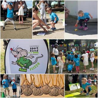 Am 14. Mai verwandelte sich die Kita Zwergenland in eine bunte Bewegungsarena. Anlass war das diesjährige Sportfest in der Kita, bei dem die Kinder das beliebte Flizzy-Sportabzeichen ablegen konnten. Nach einer gemeinsamen Aufwärmrunde mit Musik und Spaß starteten die verschiedenen Stationen: Weitsprung, Balancieren, Zielwerfen, Pendellauf, Purzelbaum, Hampelmann und Rumpfbeugen. Mit sichtbaren Stolz absolvierten die kleinen Sportler und Sportlerinnen alle Aufgaben. Am Ende erhielt jedes Kind eine Urkunde und das begehrte Flizzy-Abzeichen. Zeitgleich wurde für die Kinder und Geschwisterkinder ein eigenes Sport- und Spielangebot bestehend aus Entenangeln, Leitergolf und Dosenwerfen bereitgestellt. So war für alle anwesenden Kinder etwas dabei und alle hatten sichtlich Spaß. Als kleine Erinnerung gab es für alle Kinder eine selbstentworfene Zwergenland-Medaille. Vielen Dank an den Kreissportbund Nordsachsen für die Organisation des Flizzy-Sportabzeichen.
