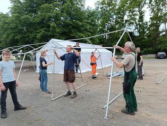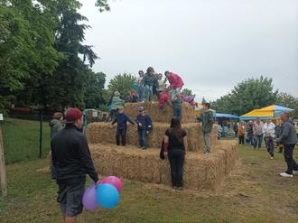 „Verkriech dich nicht bis der Regen vorbei ist, lache und tanze in den Pfützen!“ Unter diesem Motto starteten wir unser diesjähriges Kinderfest. Vom eher nass vorhergesagten Wetter ließen wir uns aber keinesfalls unsere riesige Vorfreude nehmen. Ein paar kurze Telefonate und Absprachen später standen zwei große Zelte und jede Menge hilfsbereite Eltern, Großeltern und Freiwillige bereit, um das Zelt, welches uns unter anderem die Feuerwehr Arzberg hilfsbereit zur Verfügung stellte, aufzubauen. Im Vorfeld haben viele Eltern viele leckere Kuchen gebacken. Der Erlös der Kuchen kommt unseren Kindern zugute und wir freuen uns schon sehr darauf, Herzenswünsche zu erfüllen. Die Agrargenossenschaft Arzberg rückte mit schwerem Gefährt an und baute emsig eine Strohhüpfburg auf, welche zu späterer Stunde, als die Sonne herrlich schien, enthüllt und fleißig beklettert wurde. Auch unser Träger und Bürgermeister Holger Reinboth war an diesem Tag präsent. Für all diese wunderbaren Dinge möchten wir uns ganz herzlich bedanken! Wir durften in den Vor- und Nachbereitungen solch große Hilfsbereitschaft erleben, wovon wir immer noch ganz überwältigt sind.