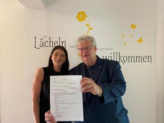 Das Team von Rebecca Dieke-Fuhrmann bezieht die ehemaligen Räumlichkeiten der Arztpraxis von Frau Dr. Vida in Triestewitz, Kamitzer Weg 5. Bürgermeister Holger Reinboth übergibt der Leiterin den Mietvertrag. Der Kontakt bleibt gleich: 034222/43900 und rebecca-miene@freenet.de.
