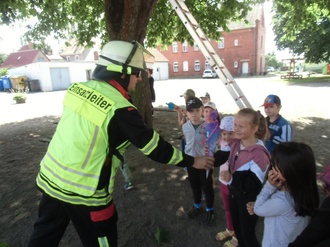 Am 28.06.2023 feierten wir in der Kita Kastanienkids unser Zuckertütenfest. In geheimer Mission, gemeinsam mit den Eltern, der Feuerwehr und der Agrargenossenschaft wurde das Fest organisiert und vorbereitet. Dieser Tag war für die Vorschulkinder somit ein Tag voller Überraschungen. Nach dem Frühstück ging es los mit einer Kremserfahrt. Ein Zwischenstopp wurde in der Milchviehanlage bei Kötten eingelegt. Wir erfuhren viel wissenswertes über die Tiere und durften uns Kühe sowie die kleinen Kälbchen anschauen. Vielen Dank dafür. Auf dem Rückweg zum Kindergarten schauten wir uns jeden Baum an. Irgendwo müssen doch die Zuckertüten zu finden sein. Aber nein, wir kamen mit leeren Händen zurück. Am Kindergarten angekommen, staunten wir jedoch nicht schlecht. An der großen Kastanie auf dem Hof hingen die Zuckertüten. War das eine Freude. Ein Problem gab es dennoch. Sie hingen so hoch, wir kamen nicht heran. Verzweifelt wie wir waren, riefen wir die Feuerwehr. Wir schilderten unser Problem und in wenigen Minuten kamen sie mit Blaulicht und 6 Mann Besatzung bei uns an. Top ausgerüstet begann ein spitzenmäßig organisierter Einsatz. Wie erwartet, unsere Feuerwehrmänner haben es geschafft. Am Ende hatte jedes Kind seine Zuckertüte und war glücklich und zufrieden.