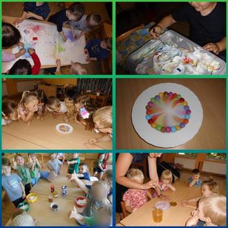 So tauchten die Kinder in der ersten Woche in die Welt der Farben ein- durch Farbexperimente, durch das Mischen verschiedener Farben um neue Farbtöne zu erhalten, durch die Zubereitung von Quark und Joghurt in verschiedenen Farben mittels bunter Früchte, sowie durch Fingerspiele, Bilderbücher und Lieder. Danke an die Imkerei Grabein für den leckeren Honig zum Süßen unserer Nachspeisen.