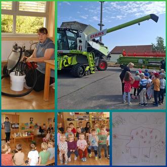 Das war das Thema der dritten Woche. Frau Rothe, die Mama eines Kitakindes, zeigte den Kindern anschaulich wie Kühe leben, welches Futter sie brauchen und wie sie gemolken werden. Jedes Kind durfte selbst einmal improvisierend „melken“. Als Wertschätzung überreichten die Kids selbst gemalte Bilder. Herr Kunz, der Papa eines Kitakindes, sorgte für leuchtende Kinderaugen und spitze Ohren, als er mit dem Mähdrescher bei uns vorfuhr, um uns hoch interessante Einblicke in seine Arbeit als Landwirt zu verschaffen und Fragen der Kinder zu beantworten.