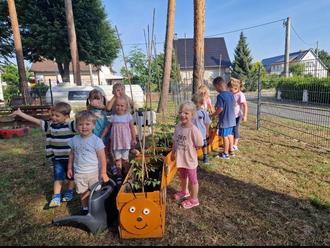 Täglich wird die Raupe von den Kindern mit Wasser versorgt, damit sie bald leckere Tomaten ernten können.