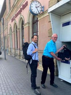 Bürgermeister Thomas Kunack (li.) und RVSOE-Chef Uwe Thiele testen die neuen Schließfächer am Nationalpark-Bahnhof Bad Schandau.