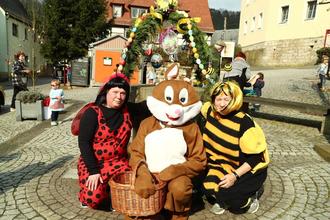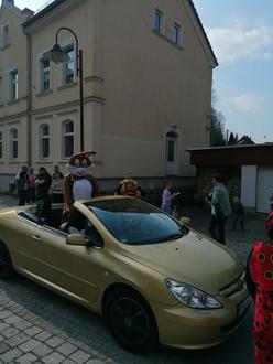 Endlich bog ein Cabriolet um die Ecke und darin stand winkend der Osterhase. Auf dem Marktplatz angekommen und von den Kindern umringt, bückte sich der Osterhase, um aus seinem Körbchen kleine Leckereien für die Kinder zu holen. Aber was war das...sein Griff ging ins Leere und nach einigem Suchen war ihm klar, dass er das Körbchen im Wald vergessen hatte. Also noch einmal schnell zurück, das Körbchen gepackt und im zweiten Anlauf klappte alles.