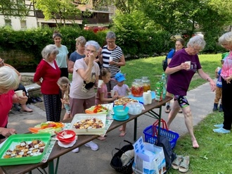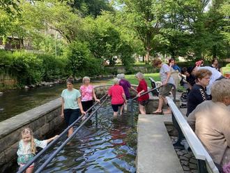 Am Donnerstag, 23. Mai 2024 trafen sich Mitglieder des Kneipp-Vereins Bad Schandau und Umgebung e.V. zum traditionellen „Anwassern“. In diesem Jahr war es der erste Gang ins Tretbecken und eröffnete gleichzeitig die Kneipp-Freiluftsaison 2024. Das Wetter spielte mit, sodass wir bei Sonnenschein und angenehmen Temperaturen die Kneippsche Lehre praktisch umsetzen konnten. Zu Beginn gab es einige Erläuterungen zum Procedere und anschließend ging es mutig in das noch recht kühle Wasser. Nach dem ersten kleinen Kälteschock wurde es angenehmer und so drehte manch einer noch weitere Runden im Becken. Anschließend fand bei warmen Temperaturen ein reger Gedankenaustausch in gemütlicher Runde statt. Einige Urlaubsgäste interessierten sich für unser Vereinsleben und wagten selbst den Gang ins Wasser. Für die anwesenden Kinder gab es neben dem Wassertreten auch Bewegungsspiele auf der Wiese. Für das leibliche Wohl hatten einige Kneippmitglieder belegte Häppchen vorbereitet. Leckere Gemüsesticks mit verschiedenen Dips ergänzten das Angebot. Für den Durst standen selbst angesetzte Erfrischungsgetränke wie Kräuterlimonade und alkoholfreie Maibowle zur Verfügung.