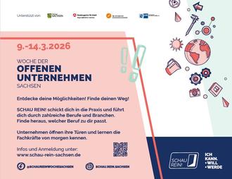 SCHAU REIN! ist ein Projekt im Auftrag des Freistaates Sachsen und wird unterstützt von der Bundesagentur für Arbeit, Regionaldirektion Sachsen, den sächsischen Handwerkkammern sowie den sächsischen Industrie- und Handelskammern.