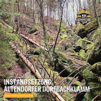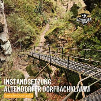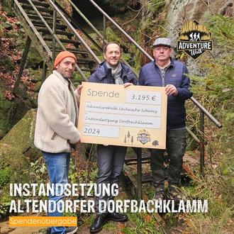 Anlässlich jedes AdventureWalk unterstützen wir eines oder mehrere regionale Projekte mit 1 Euro pro Teilnehmer. Im Nachgang zum AdventureWalk Sächsische Schweiz haben wir am 10.12.2024 den Spendenscheck für die Instandsetzung des unteren Teils der Altendorfer Dorfbachklamm übergeben. Christian Gertel ist dafür nach Bad Schandau gefahren, hat Herrn Klimmer von der „Interessengemeinschaft Stiegen- und Wanderfreunde“ und den Bürgermeister von Bad Schandau, Thomas Kunack, getroffen und sich ein Bild vor Ort gemacht. Vor allem einige Treppen können dank der Spende gesäubert und saniert werden.