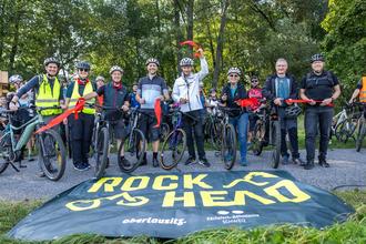 Eröffnung der neuen Gravelbike-Strecke "RockHead" am Rastplatz neben der Himmelsbrücke mit Tino Richter, Bürgermeister v. Bad Schandau Thomas Kunack, Landrat Dr. Stephan Meyer, Staatsministerin Barbara Klepsch, Bürgermeister Hagen Israel und Olaf Franke