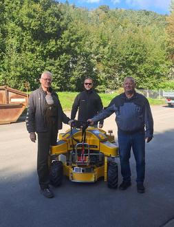 Herr Brunner von der Fa. Rumsauer erklärte den Kollegen vom Bauhof Bad Schandau das Gerät und gab eine Einführung in die Bedienung des Mähers. Durch die Mitarbeiter erfolgte dann auch gleich der erste Probeschnitt auf dem Gelände des Bauhofes.