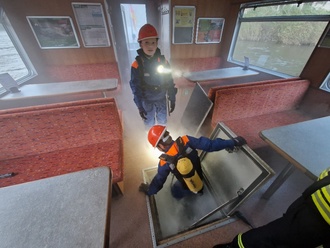 Kurz nachdem die Kinder von der Spendenübergabe bei dm zurück im Gerätehaus waren ertönte das erste Mal an diesem Wochenende die Sirene. Auf dem Wanderschiff der RVSOE war ein Brand in den Unterdeckräumen ausgebrochen. Das Schiff konnte sich an den Fähranleger in Schmilka retten, allerdings wurde nach ersten Löschversuchen durch die Besatzung der Steuermann des Schiffes vermisst. Eingetroffen am Einsatzort bestätigte sich die Lage. Es galt einen Löschangriff durchzuführen und die vermisste Person mit Atemschutz aus dem stark verrauchten Unterdeckraum zu retten. Diese Aufgabe erledigten die Kinder sehr gewissenhaft. Als Tagesabschluss durften alle mit dem Schiff zurück zum Gerätehaus nach Bad Schandau fahren. Das hat allen viel Spaß gemacht.