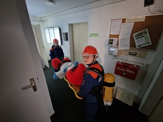 Nachdem die Person aus dem Gebäude gebracht und an den Rettungsdienst übergeben war stand nun noch die Brandbekämpfung an. Unter Atemschutz löschte der Angriffstrupp die Flammen und der Einsatz konnte erfolgreich abgeschlossen werden. Im Einsatzleitwagen wurde der Lagefilm mitgeschrieben und die Atemschutzüberwachung durchgeführt.