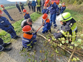 Nachdem die Besatzung der Bad Schandauer Fahrzeuge schon eine halbe Stunde vorher alarmiert wurde, um einen entlaufenen Löwen und einen Affen einzufangen, durften nun auch die Kinder der Porschdorfer Fahrzeuge ihren nächsten Einsatz abarbeiten. Auch für sie ging es auf die Straße „Zum Bockstein“ nach Porschdorf. Mittels Bügelsäge sägten sie den umgestürzten Baum klein und machten so den Weg für die Bad Schandauer Fahrzeuge wieder frei, die in der Zwischenzeit den Löwen und den Affen vom Baum gerettet und an den Zirkus übergeben hatten. Gemeinsam rückten beide wieder ins Gerätehaus Bad Schandau ein.