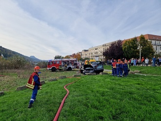 Kurz vor sechzehn Uhr ging erneut die Sirene. Es wurde ein Verkehrsunfall mit zwei verletzten Personen und ein durch den Verkehrsunfall ausgelöster Wiesenbrand auf der Elbwiese unterhalb der Toskana Therme gemeldet. Nach der ersten Lageerkundung durch den Einsatzleiter wurde das Bad Schandauer Hilfeleistungslöschfahrzeug beauftragt, die Personen aus dem PKW zu befreien und an den mitalarmierten Rettungsdienst zu übergeben sowie das Fahrzeug zu sichern. Alle anderen Kinder hatten den Auftrag mit dem Material des Porschdorfer Mittleren Löschfahrzeuges einen Löschangriff aufzubauen und den Wiesenbrand zu löschen. Dieser Einsatz war zugleich auch die Abschlussübung dieser Tage der Berufsfeuerwehr. Alle Kinder zeigten ihren Eltern, Verwandten und den anderen Zuschauern, was sie gelernt haben.
