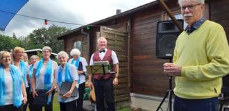 Unsere Kleingärtner hatten zu ihrem jährlichen Vereinsfest am 15. Juni eingeladen. Leider war unser Chorleiter an diesem Tag verhindert. Eine Absage kam für uns nicht in Frage und weil wir nach vergangenen Auftritten bei den Kleingärtnern immer wieder erfuhren, dass sie doch auch gern mitsingen würden, aber leider die Texte und … und … Nun, wir kennen das. Also, Texte in ausreichender Zahl verteilt und es begann ein gemeinsames Volksliedersingen mit tonangeberischer Hilfestellung vom Musiker Hardy.