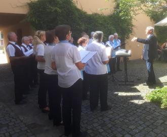 Tags darauf standen wir (gemeinsam mit dem Chorleiter) im Arkadenhof und erfreuten die hier Anwesenden nicht nur mit Gesang, sondern auch mit selbstgebackenem Kuchen unserer Sängerinnen und Sänger. Dabei, wie schon oft und immer wieder gern auch gehört, gab es neben Chorgesang auch eine solistische Einlage unseres Chorleiters.