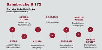 Damit das Widerlager der Behelfsbrücke gebaut werden kann, muss der Hang entlang der B 172 abgesichert werden. Diese Arbeiten sind für April bis Juli 2026 geplant. Der Verkehr soll überwiegend halbseitig geführt werden. Aus technischen Gründen werden aber auch kurze mehrtägige Vollsperrungen notwendig. Darüber werden wir rechtzeitig informieren. Der dort verlaufende Wanderweg wird während der Bauzeit gesperrt und umgeleitet.