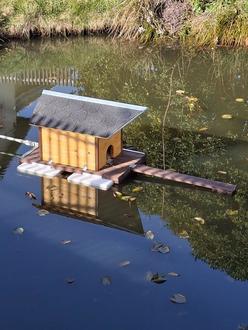 Auf dem oberen Dorfteich in Waltersdorf ist nun wieder ein Entenhäuschen zu finden.