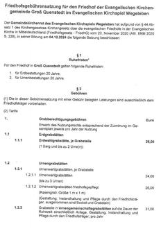| Ab dem 01.01.2025 tritt für die Gemeinde Groß Quenstedt eine neue Friedhofsgebührensatzung in Kraft. Die neue Ordnung kann eingesehen werden: | |