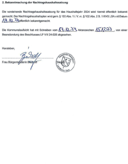 Die vorstehende Nachtragshaushaltssatzung für das Haushaltsjahr 2024 wird hiermit öffentlich bekannt gemacht. Der Nachtragshaushaltsplan wird gem. § 103 Abs. 1 i. V. m. § 102 Abs. 2 S. 1 KVG LSA mit Datum 19.12.2024 öffentlich bekanntgemacht.