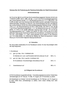 Auf Grund der §§ 5,8 und 99 des Kommunalverfassungsgesetz Sachsen-Anhalt vom 17.06.2014 (GVBl. LSA S. 288), der §§ 1, 2 und 3 des Kommunalabgabengesetzes des Landes Sachsen-Anhalt i. d. F. der Bekanntmachung vom 13.12.1996 (GVBl. LSA S. 405), der §§ 1 und 2 des Gesetzes über die Einführung einer optionalen Festsetzung differenzierender Hebesätze im Rahmen des Grundvermögens bei der Grundsteuer des Landes Sachsen-Anhalt (Grundsteuerhebesatzgesetz Sachsen-Anhalt - GrStHsG LSA) i. d. F. der Bekanntmachung vom 08.11.2024 (GVBl. LSA 2024 S. 312), der §§ 1 und 16 des Gewerbesteuergesetzes i. d. F. der Bekanntmachung vom 15.10.2002 (BGBl. I S. 4167) in der jeweils geltenden Fassung sowie der §§ 1, 25 und 28 des Grundsteuergesetzes vom 7. August 1973 (BGBl. I S. 965) in der ab dem 01.01.2025 geltenden Fassung des Gesetzes zur Reform des Grundsteuer- und Bewertungsrechts vom 26.11.2019 (BGBl. I, S. 1794), zuletzt geändert durch Artikel 21 des Gesetzes vom 16.12.2022 (BGBl. I S. 2294) hat der Stadtrat der Stadt Schwanebeck in seiner Sitzung am XX.XX.XXXX folgende Satzung beschlossen: