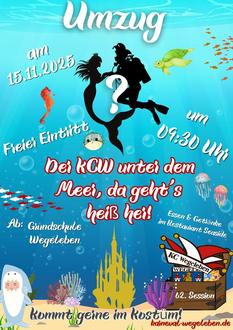 Also, am 15.11.2025 in Wegeleben ab 09.30 Uhr, startet mit uns in die 62. Session des Wegelebener Karnevals unter dem Motto, „Der KCW unter dem Meer, da geht`s heiß her!“ Alle sind herzlich willkommen!