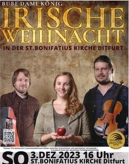 In Ihrer Heimatstadt Halle/Saale ist das Weihnachtskonzert der mehrfach preisgekrönten Band Bube Dame König seit Jahren ein Hit mit über 500 Besuchern in jeder Saison. Nun wollen die drei Musiker Juliane Weinelt, Jan Oelmann und Till Uhlmann am 3. Dezember 2023 auch das Publikum in der St.Bonifatiuskirche Ditfurt auf die winterliche Grüne Insel mit ihren faszinierenden Bräuchen entführen: Zwar schneit es dort eher selten, dafür servieren die Iren aber gerne Whiskykuchen zum Fest oder stellen Santa Claus ein Gläschen Guinness auf dem Kaminsims bereit. Im Gepäck hat das Trio neben solchen Anekdoten ihre bewährte Mischung aus englischsprachigen Carols, rasanten Tanzstücken und dem ein oder anderen hiesigen Weihnachtslied im überraschenden Irish Folk Sound.