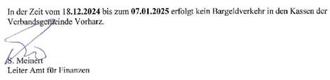 Zur Sicherung der Jahresabschlussarbeiten in der Verbandsgemeinde Vorharz wird der Kassenschluss auf