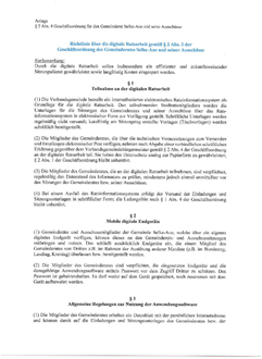 (2a) Die Gemeinde betreibt als Grundlage für die digitale Ratsarbeit ein internetbasiertes elektronisches Ratsinformationssystem. An der digitalen Ratsarbeit kann jedes Mitglied des Gemeinderates durch verbindliche schriftliche Erklärung gegenüber dem Bürgermeister teilnehmen. Diese Erklärung gilt für die gesamte laufende Wahlperiode des Gemeinderates. Das Nähere regelt die Richtlinie über die digitale Ratsarbeit in der Anlage der Geschäftsordnung.