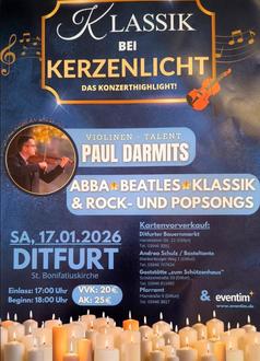 Das „BEST OF“ von ABBA, den Beatles und der Klassikwelt sowie eine Auswahl an bekannten Liedern aus der Rock- und Popmusik, erleben sie bei „Klassik bei Kerzenlicht“. Ein Meer aus Kerzen und eine ganz besondere Atmosphäre geben dem Konzert, gespielt vom Violinen – Talent Paul Darmits, einen ganz besonderen Flair.