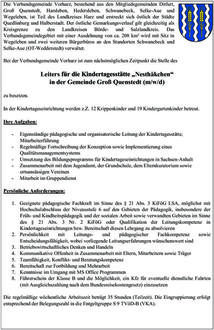 | 1. | Geeignete pädagogische Fachkraft im Sinne des § 21 Abs. 3 KiFöG LSA, möglichst mit Hochschulabschluss der Niveaustufe 6 auf den Gebieten der Pädagogik, insbesondere der Früh- und Kindheitspädagogik und der sozialen Arbeit sowie verwandten Gebieten im Sinne des § 21 Abs. 3 Nr. 2 KiFöG oder Qualifikation der Leitungskompetenz in Kindertageseinrichtungen bzw. Bereitschaft diesen Lehrgang zu absolvieren |