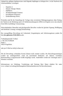 | Anhand des gültigen Impfausweises sind folgende Impfungen zu belegen bzw. ist der Nachweis bei Arbeitsaufnahme vorzulegen: | |