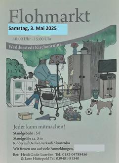Am Samstag, 3. Mai 2025, von 10 bis 15 Uhr findet in bzw. an der Kirchenruine Wedderstedt wieder ein Frühlingsflohmarkt statt. Bei begonnenen Baumaßnahmen wird der Ort kurzfristig verlegt. Der Freundeskreis Wedderstedter Glocke e.V. lädt ein mitzumachen. Die Standgebühr beträgt 5 Euro, Standgröße ca. 3 Meter; Kinder auf Decken verkaufen kostenlos. Wir freuen uns über viele Anmeldungen unter 039481 81340.