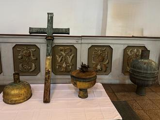 Im Zuge der Dacherneuerung wurde die Bekrönung abgenommen: Wetterfahne, Turmkugeln und auch das Kreuz. Die Wetterfahne und Turmkugeln werden aktuell restauriert, das Kreuz muss ganz und gar neu hergestellt werden. Das Wetter der letzten Jahrzehnte hat das Holzgestellt unter der Metallummantelung völlig zersetzt. Ende Mai werden voraussichtlich die Dacharbeiten abgeschlossen sein und die Bekrönung wieder das Dach zieren. Auch 2025 legen wir in die Turmkugeln wieder Zeitkapseln hinein. Das gibt uns die Möglichkeit, zu den alten auch aktuelle Zeitdokumente hineinzulegen – wie z.B. ihren Namen, als Spender und Unterstützer unserer Restaurierungsarbeiten.