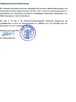 Die vorstehende Haushaltssatzung für das Haushaltsjahr 2023 wird hiermit öffentlich bekannt gemacht. Der Haushaltsplan mit seinen Anlagen liegt nach § 102 Abs. 2 Satz 1 des Kommunalverfassungsgesetzes zur Einsichtnahme vom 15.06.2023 bis 27.06.2023 im Verwaltungsamt Schwanebeck, Kapellenstraße 16 in 39397 Schwanebeck, Zimmer 34 öffentlich aus.