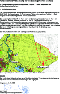 Der Verbandsgemeinderat der Verbandsgemeinde Vorharz hat in seiner öffentlichen Sitzung, am 03.07.2023, die Aufstellung der 17. Änderung des Flächennutzungsplanes „Teilplan 3 – Stadt Wegeleben“ der Verbandsgemeinde Vorharz beschlossen.