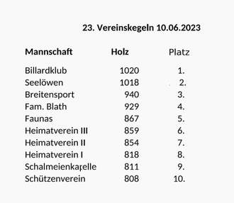 Mit einem hauchdünnen Vorsprung von nur 2 Holz siegte der Billardclub vor den Seelöwen. Damit erkämpfte sich der Billardclub zum dritten Mal in Folge den Mannschaftssieg und damit den Pokal.