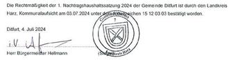 Die vorstehende Nachtragshaushaltssatzung für das Haushaltsjahr 2024 der Gemeinde Ditfurt wird hiermit öffentlich bekannt gemacht. Der Nachtragshaushaltsplan mit seinen Anlagen liegt nach § 102 Abs. 2 Satz 1 des Kommunalverfassungsgesetzes Sachsen-Anhalt zur Einsichtnahme vom 18.07.2024 bis 01.08.2024 im Verwaltungsamt Schwanebeck, Kapellenstraße 16 in 39397 Schwanebeck, Zimmer 34 öffentlich aus.