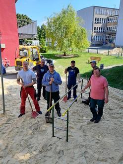 Damit nicht genug, dank fleißiger Helfer, Daniel Siede, Maximilian Meier, Luca Strauch, Oleksander Zaitcev und Ulf Haase (alle Mitarbeiter der HAG), sowie Frank Sinnemann (Mitarbeiter Bauhof Harsleben) wurde der Sand in alle Bereiche der Kita (Krippe, Kiga, Hort) verteilt.