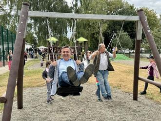 Landrat Thomas Balcerowski (links) ließ es sich nicht nehmen, gemeinsam mit Bürgermeister Adolf Speck die neuen Schaukeln auszuprobieren. Fotos: Dieter Kunze