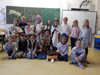 Mit einer kleinen Theateraufführung Weihnachtsgeschichte begeisterten die Kinder der Klasse 3b ihre Mitschüler zum neuen Jahr. Von der Vorbereitung, über das Proben bis zur Aufführung haben sich alle richtig ins Zeug gelegt. So mancher hat ein neues Talent entdeckt, andere waren voll in ihrem Element – alle haben es toll gemacht und das Publikum dankte es mit großem Applaus.